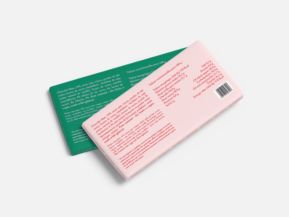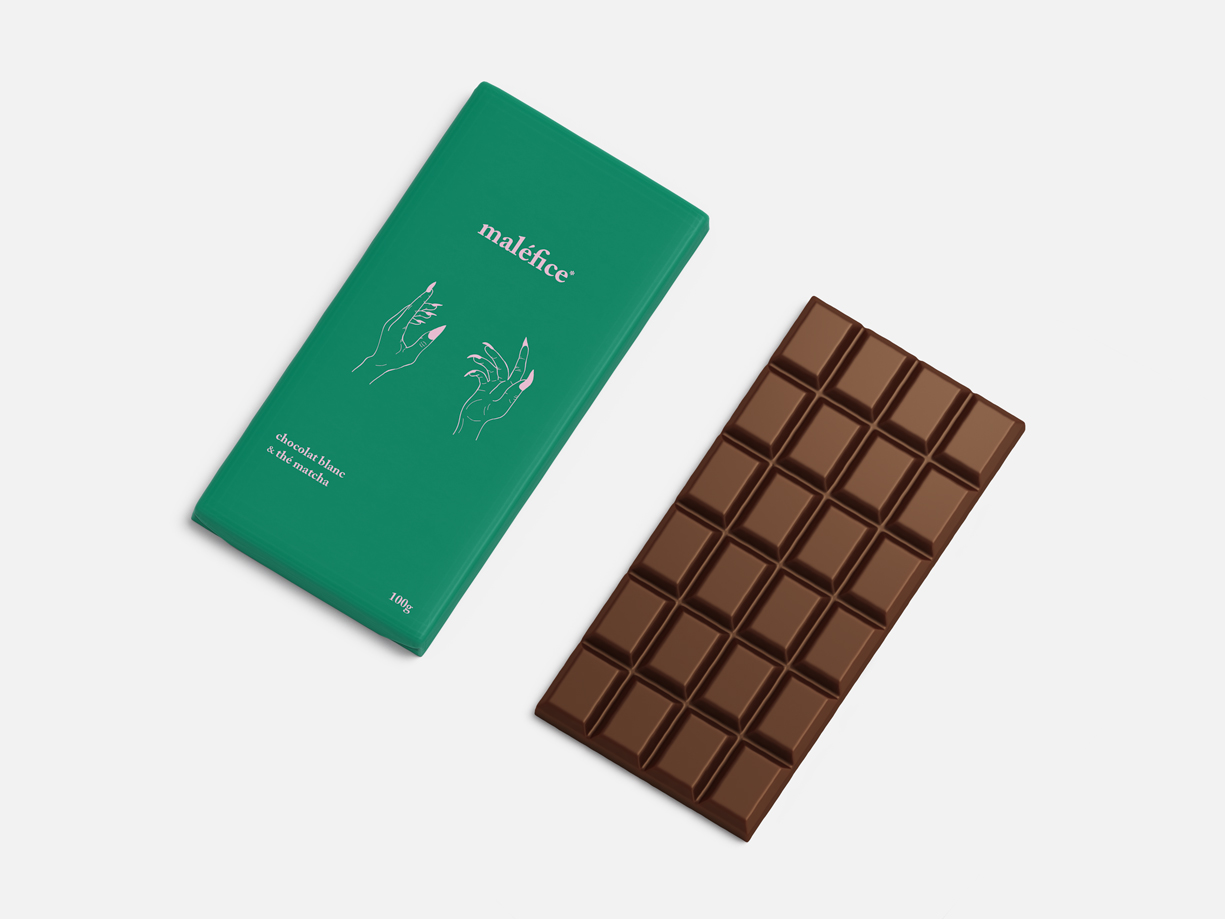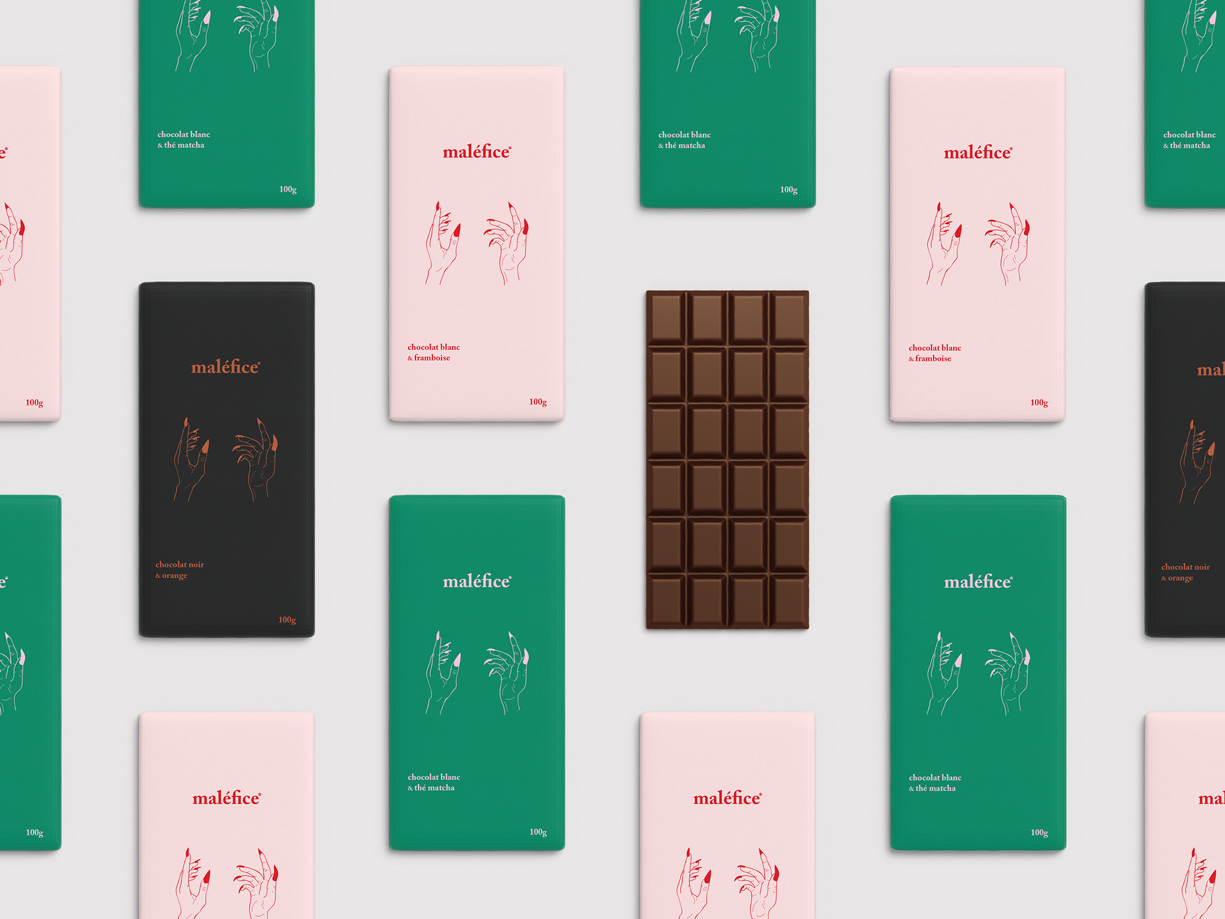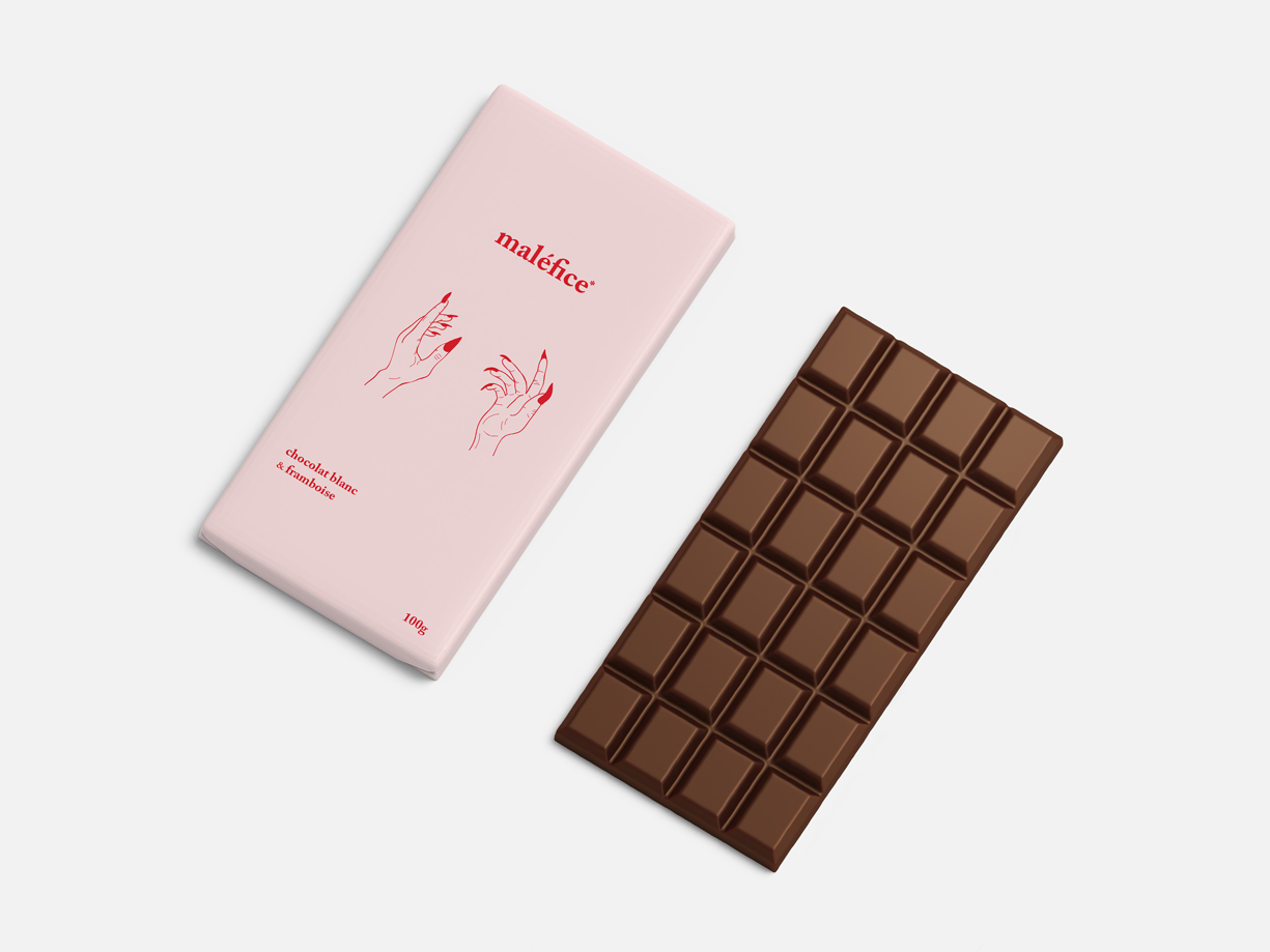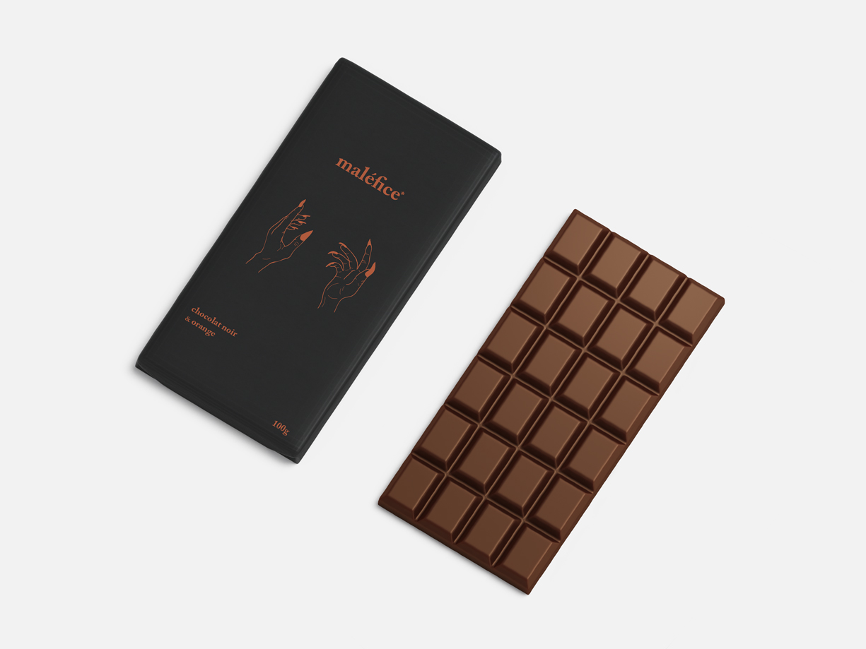 J'ai créé «maléfice*» qui est une marque de chocolat fictive. L'idée derrière le nom et le design de cette marque était de faire un parallèle entre addiction au chocolat et sorcellerie. L'astérisque dans le nom est justement là pour avertir le consommateur. Une bouchée du chocolat «maléfice*» et vous voilà rendu accro.